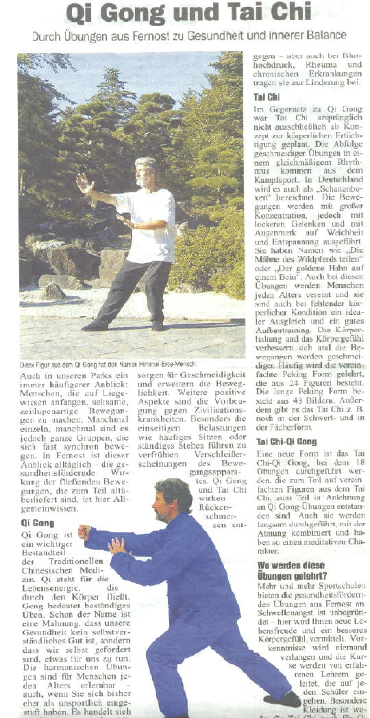 Künftig sollen auch in Berlin Qualitätssiegel-Angebote durchgeführt werden (Infos: Tai Chi Berlin/ Qigong Berlin). In einem Zeitungsbericht (Beratung und Fotos vom Dachverband wurden den Berliner Lesern interessante Details zu den chinesischen Bewegungskünsten Tai Chi und Qigong erläutert. Dargestellt wurden die positiven Auswirkungen auf die Gesundheit und Lebensqualität, die Geschichte und Formen/Stile. Berichtet wird abschließend (links von der Werbung), dass in Berlin Tai Chi und Qigong in Sportschulen angeboten werde und Schwellenängste aufgrund der "erfahrenen Lehrer" unbegründet seien. Diese Einschätzung deckt sich allerdings nur zum Teil mit den Untersuchungen des Dachverbandes. Diese zeigen, daß gerade der Laie sehr wohl kritisch bei er Anbieterwahl sein sollte. Etliche Qualitätsstandards des Dachverbandes z. B. werden in Berliner Schulen nicht eingehalten. Oft ist die Ausbildung der Lehrer unzureichend. Bericht der Gazette-Berlin/ Charlottenburg Nr. 2 Februar 2007 |